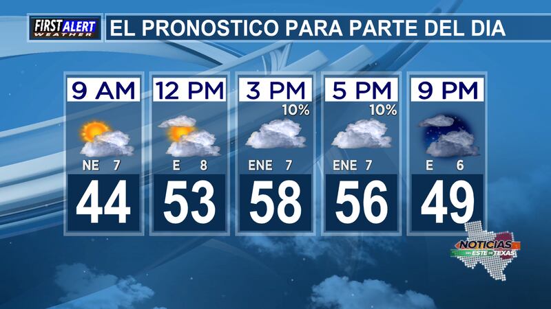 ESTE DE TEXAS (NOTICIAS DEL ESTE DE TEXAS) - ¡Buenos días, este de Texas! Es un comienzo frío con cielos parcialmente nublados y temperaturas en los 30 y 40 grados esta mañana.